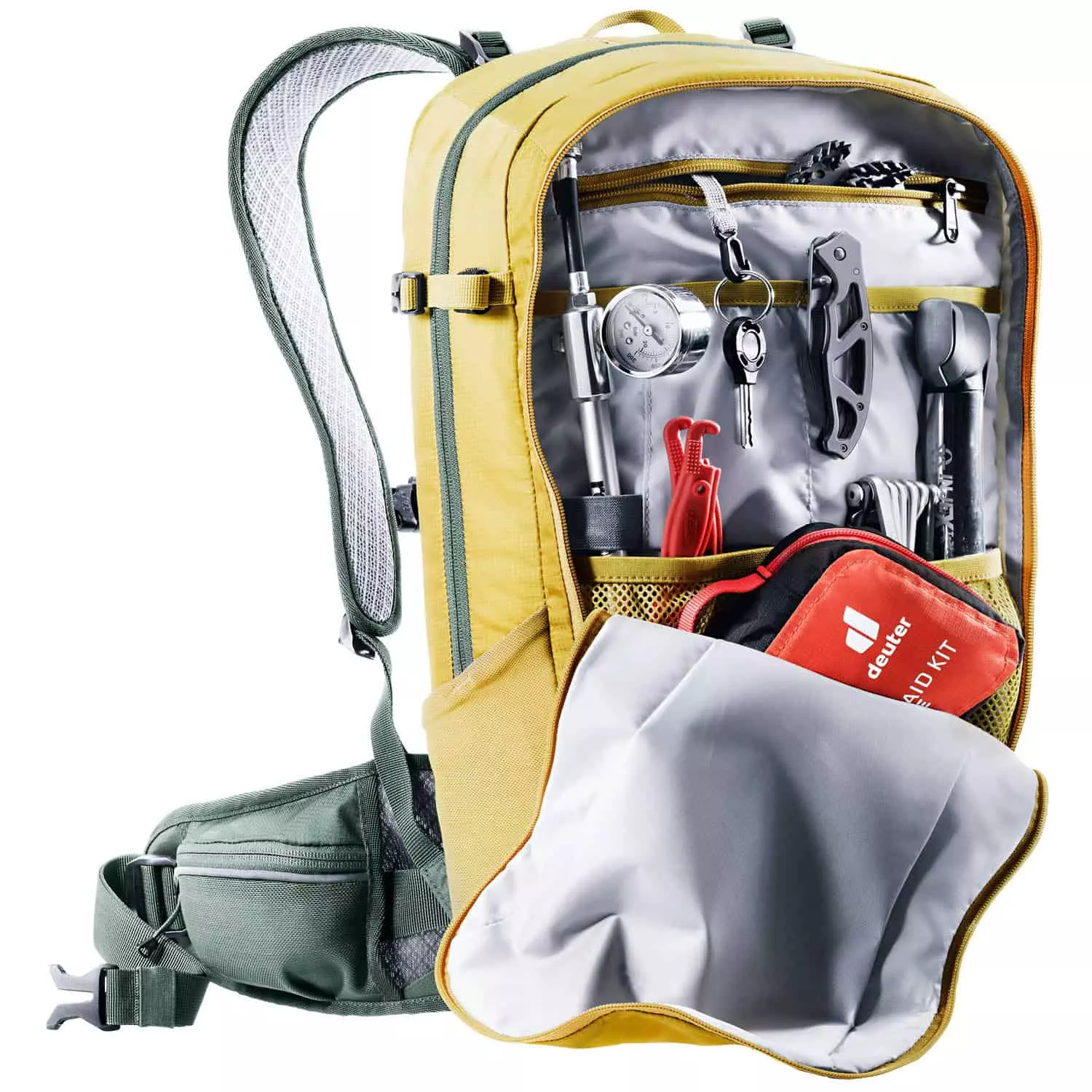 Werkzeug, Ersatzschlauch, Minipumpe und mehr finden Platz in der