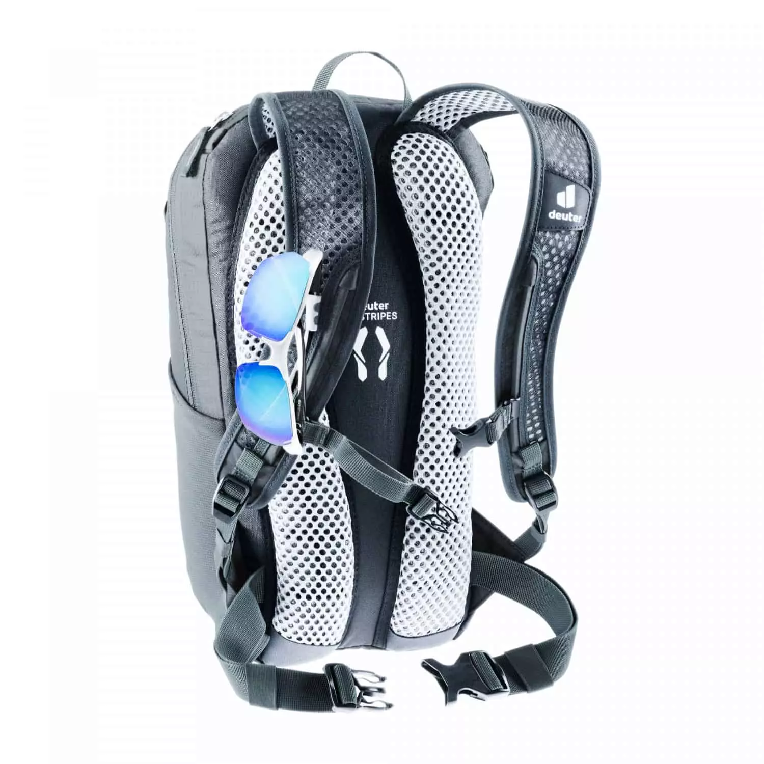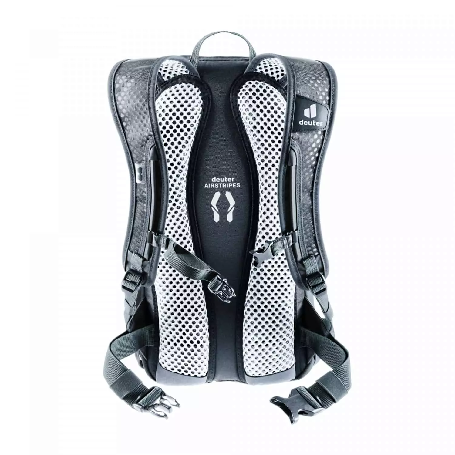 RĂŒckensystem Airstripes: RĂŒckensystem Airstripes: Ein gutes Tragesystem fixiert den Rucksack fest am Körper und belĂŒftet ihn gleichzeitig, damit man nicht im SchweiĂ ertrinkt. Deuter gelingt dies durch zwei vertikal verlaufende Polster, auf denen der Rucksack am RĂŒcken aufliegt. Dazwischen bildet sich ein Luftkanal, durch den Luft strömt, die den RĂŒcken kĂŒhlt. Zudem sind die Polster aus Air Spacer Mesh selbst atmungsaktiv, da sie von LĂŒftungskanĂ€len durchzogen sind, sodass auch durch die AuflageflĂ€che Luft zirkuliert. Dadurch schafft Deuter es, dass 80 Prozent des RĂŒckens belĂŒftet werden. Dennoch sitzt der Rucksack eng und fest am Körper, weshalb er auch bei wilden Fahrmanövern nicht hin und her geschleudert wird.