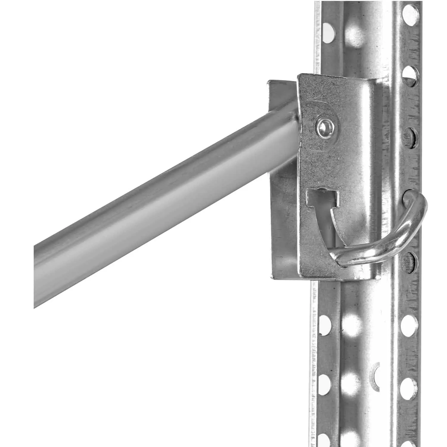 Der silberfarbene Wandhalter wird aus verzinktem Stahl gefertigt, was für